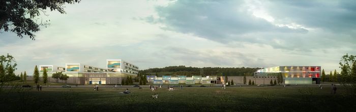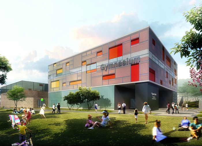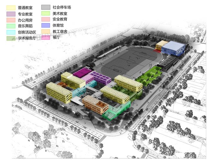 打破传统校园功能分区明确、封闭管理的模式,资源利用最大化。由剧场、图书馆、艺术楼、体育馆构成的整个艺体中心,面向社会开放。东侧临界设计为对外开放的多功能入口,人性化的设计方便居民使用,恢弘的地景式建筑与周边环境完美呼应。