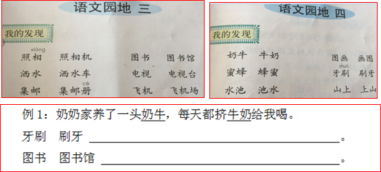 本次检测涵盖了三四单元课文、课后及园地中的各个小的知识点,由于题量有限,我们灵活地将知识点进行了整合,并考查其运用。如园地三和园地四中的“我的发现”一题有异曲同工之处,以往我们大多是单独考查孩子对词语的变换,给出照相,引导孩子填照相机,或者直接给出两条线,引导孩子们自由发挥,这次,我们在出题时进行了适当合并,引导学生把牙刷、刷牙、图书、图书馆这些词语放到具体的句子中,以考察学生对这些词语的理解运用能力。