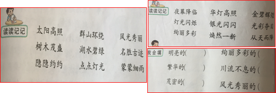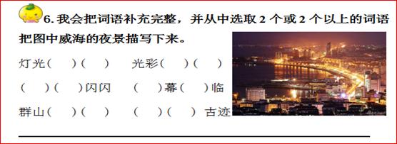 再比如:第三单元的主题是可爱的家乡,第11课和14课的课后都要求学生积累优美的四字词语,而园地三“我会填”一题中也考察了学生对四字词语的运用,以往,我们也是机械地引导孩子通过填空,或者选一个词语来说一句话来考查孩子们对词语的掌握情况。可是仔细想想,我们积累词语的目的就是为让孩子在生活中学以致用。因此本次试题中,我们就在这些词语旁边给出了一幅威海海滨的夜景图,引导学生用自己积累的词语描写下来,这样检测出来的不仅仅是静态的学科知识,也不仅仅是知识的再现与再认,更多的是检测了学生对知识的运用能力,注重了实践性。