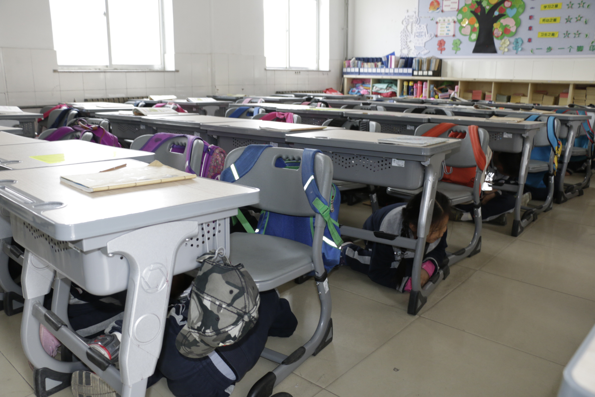 5月11日课间操,鲸园小学举行防震校园安全应急疏散演练。图为学生在教室里避震的情景。