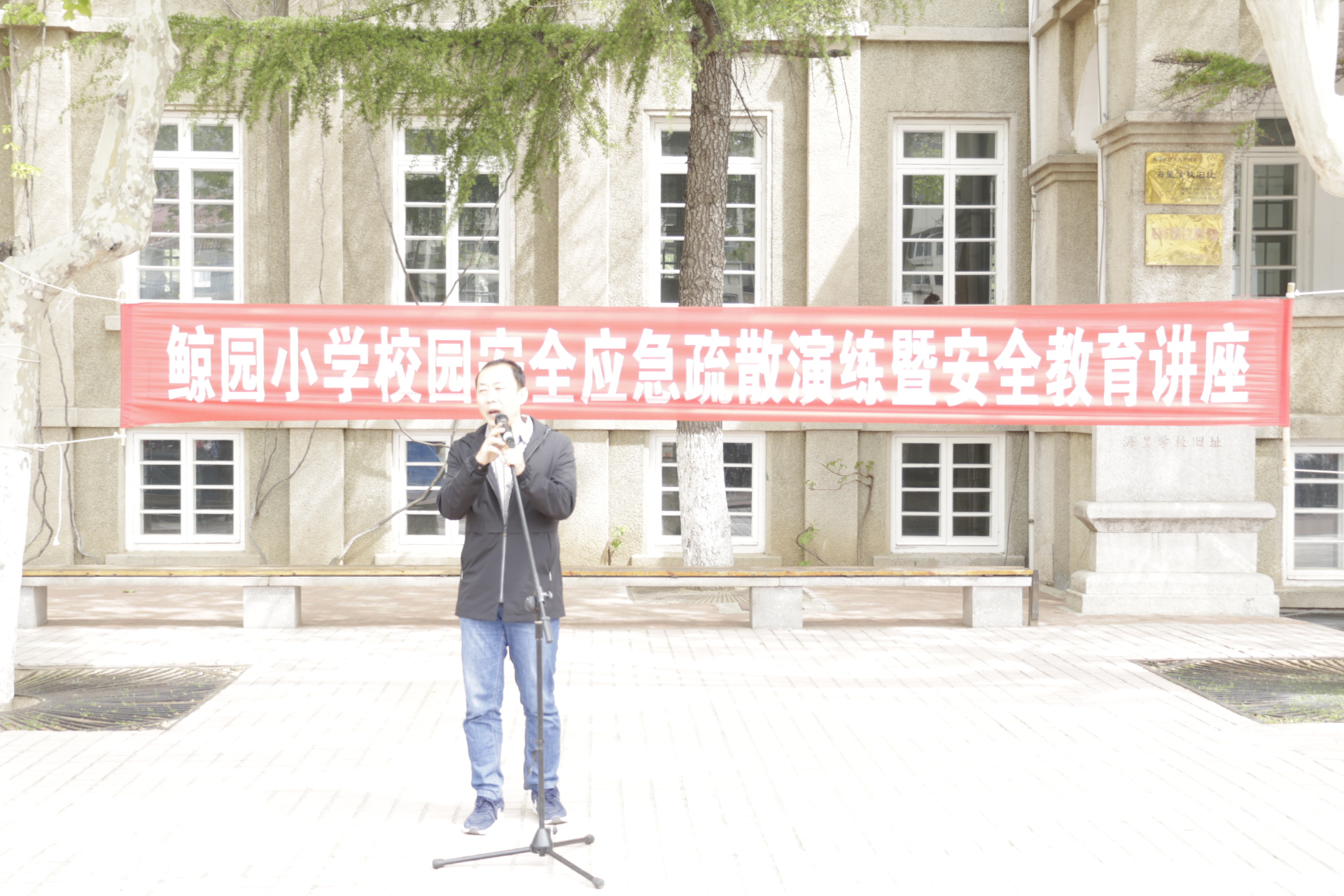 5月11日课间操,鲸园小学举行防震校园安全应急疏散演练。图为演练完毕,威海市地震局应急科徐大伟科长进行演练总结及防震知识讲座。 5月11日课间操,鲸园小学举行防震校园安全应急疏散演练。图为学生在老师引导下观看地震科普展板的情景。