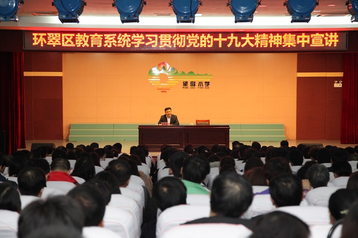 为认真贯彻习近平总书记对党的十九大精神宣讲工作的重要指示精神,深入学习宣传党的十九大精神,11月28日,按照区委部署,环翠区教育系统学习贯彻党的十九大精神集中宣讲在威海市望岛小学举行。区教育局机关全体人员,直属部门中层以上领导干部,中小学校长及中层领导干部,幼儿园园长,民办教育机构负责人等,共计500余人参加会议。