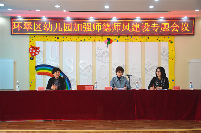 4月25日,环翠区幼儿园师德师风建设专题会议在望岛幼儿园召开,区教育局党委委员孙守霞同志出席会议并讲话,区教育局学前科相关负责人和全区62名幼儿园园长参加会议。