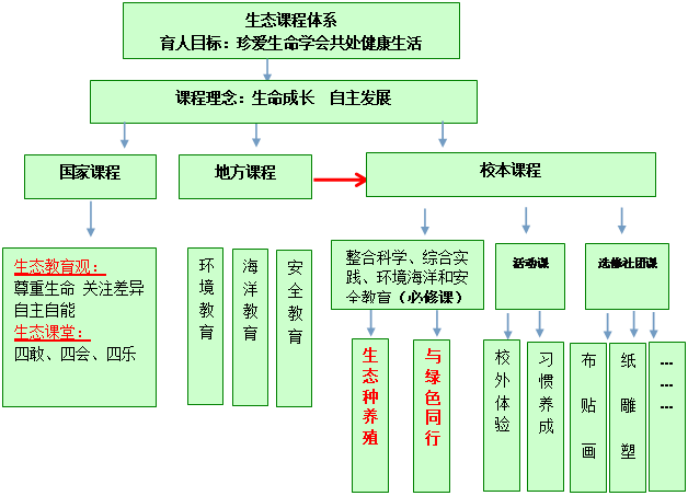 围绕学校育人目标:珍爱生命、学会共处、健康生活,我们建构了以“多样共生·自主发展”为课程理念的生态课程体系。